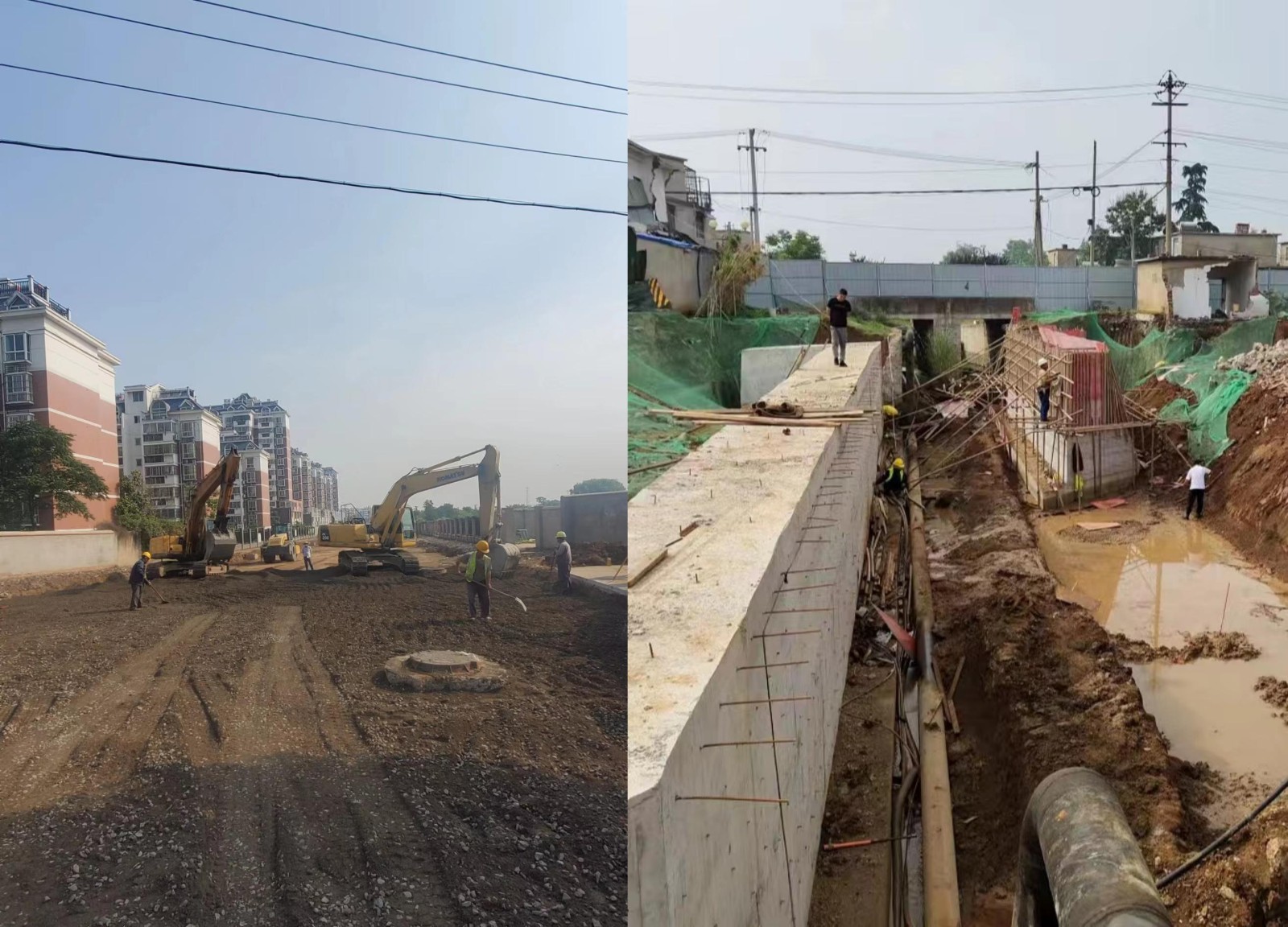 工程自開(kāi)工至端午節(jié)前,已完成(樁號(hào)K0+365~K0+745段)土方工程、雨污管網(wǎng)工程、灰土工程及二層水穩(wěn)工程;橋涵工程(樁號(hào)K0+893.878)下部結(jié)構(gòu)基礎(chǔ)及橋身澆筑。